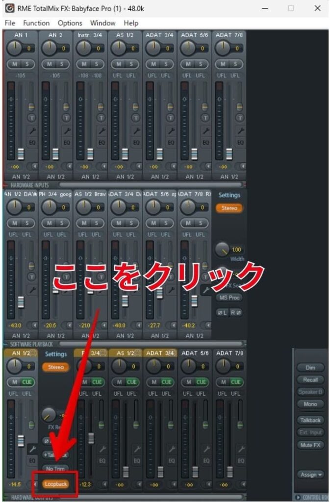 録音するにはRME Totalmix FXのループバック機能を使用します